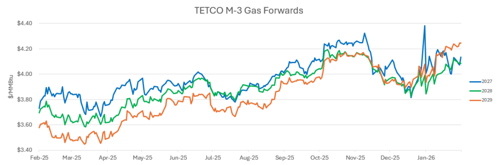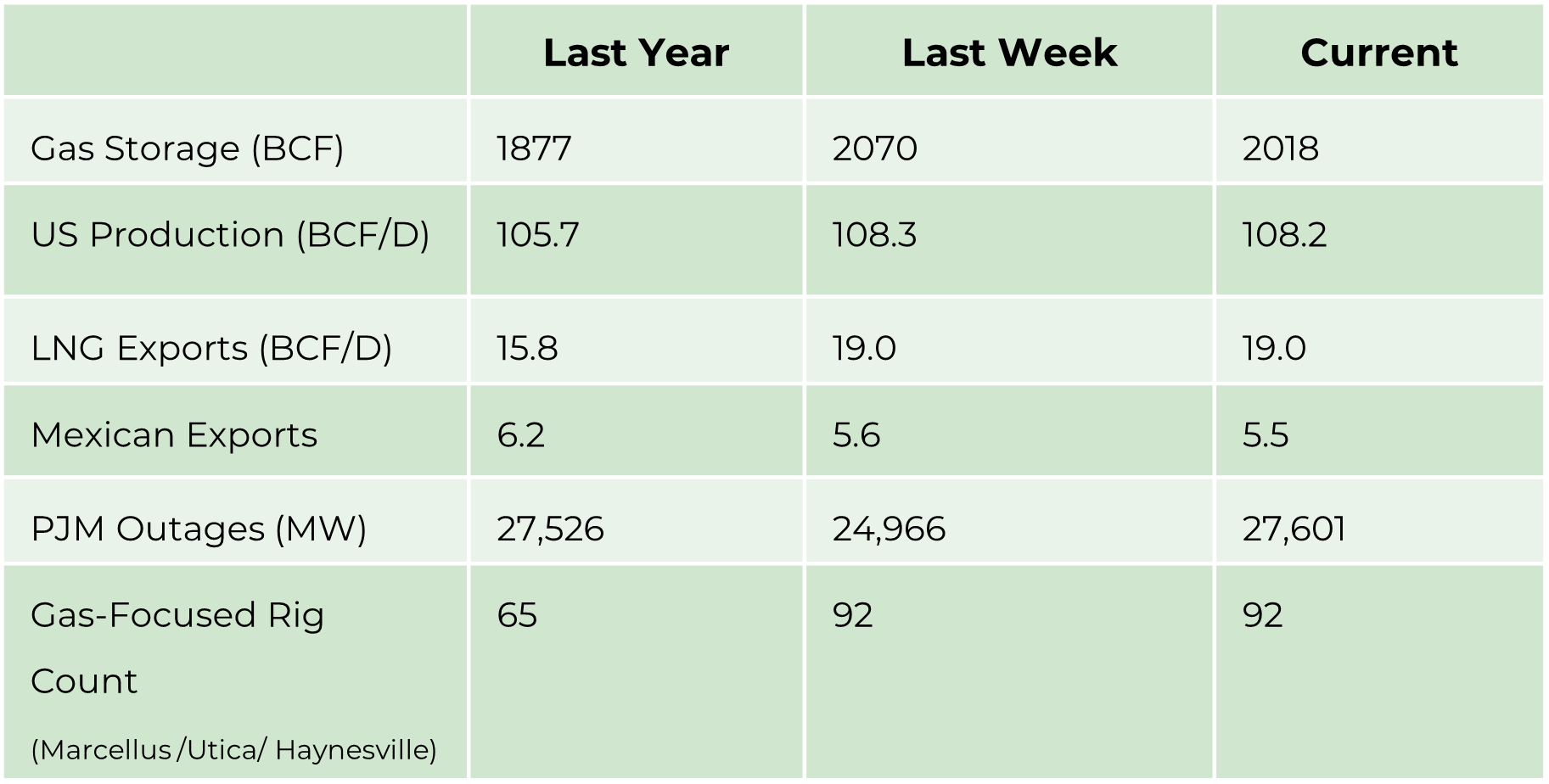 • LNG exports have returned to pre-Fern levels after an almost 6 BCF/D cut during the peak of the cold. Those export cuts helped support the grid as domestic gas prices escalated to factors above global LNG prices and acted as virtual storage.