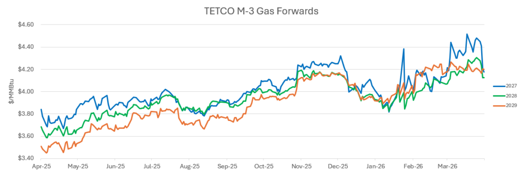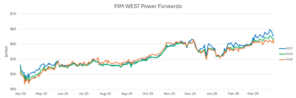 - Electricity prices are also staying low (for now). With natural gas prices, power prices have been pushed lower with the help of the weakness in cash prices, even as maintenance outages have pushed above 50,000 MW, which is normal for this time of year.